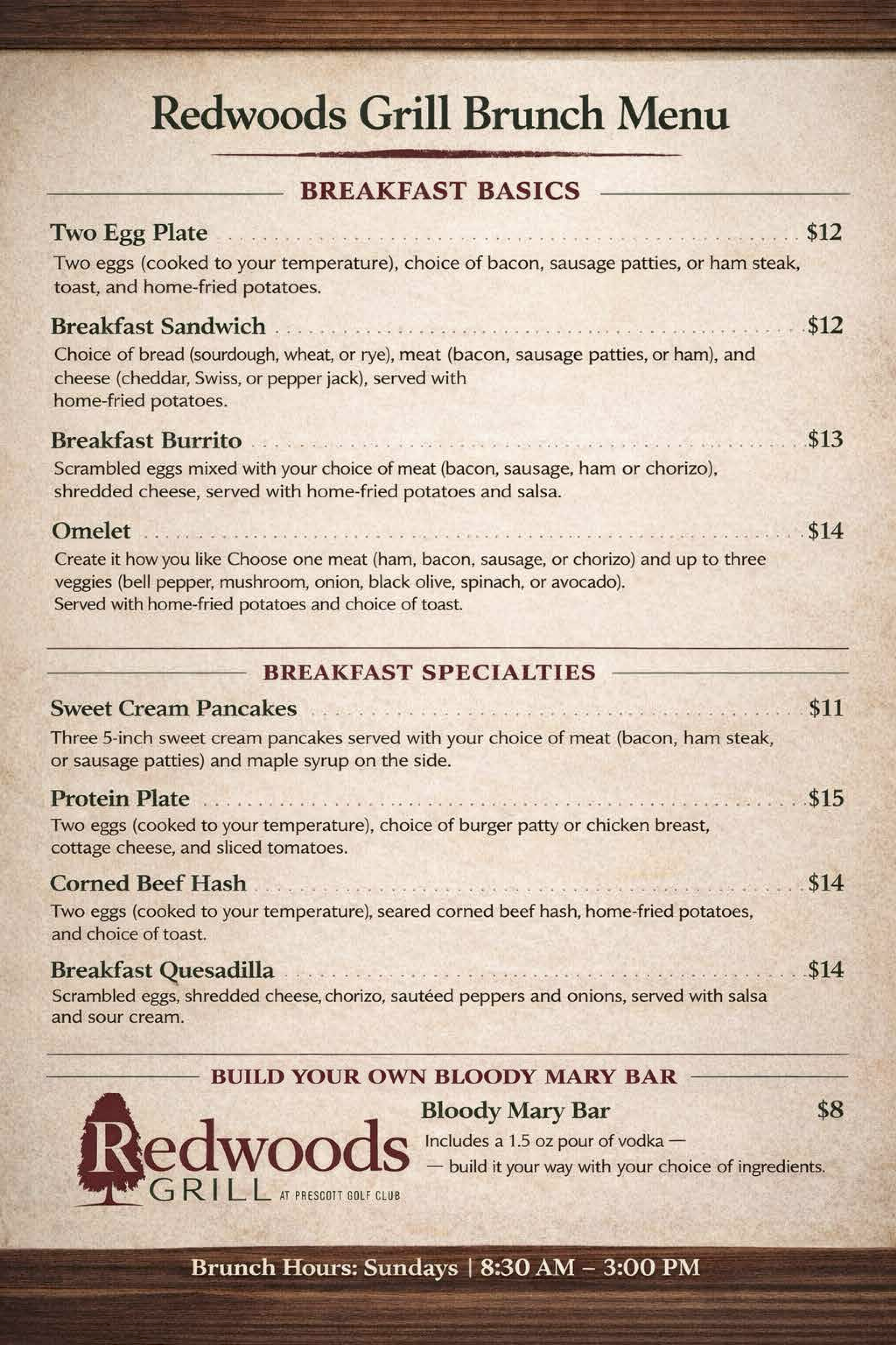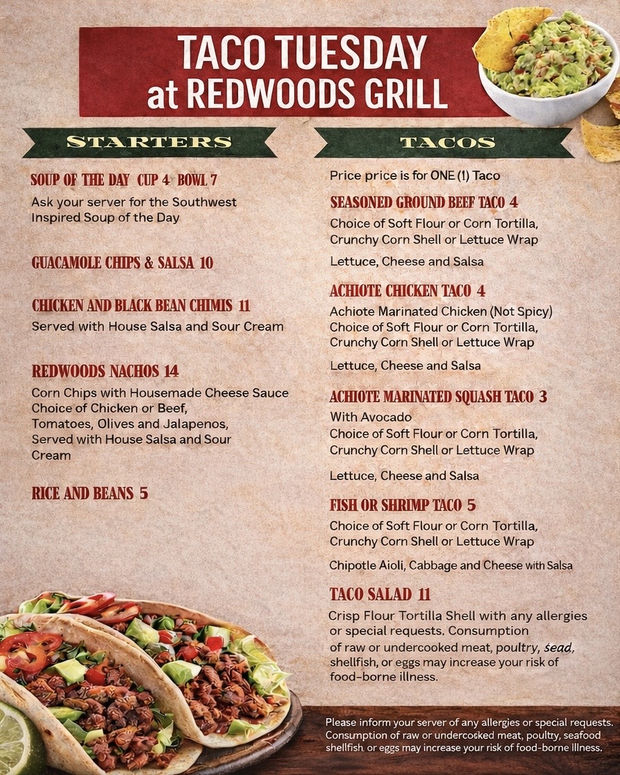 Redwoods Grill Menu Brunch Menu Taco Tuesday Menu